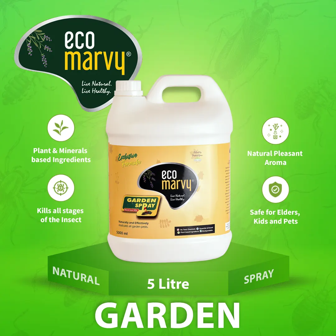 EcoMarvy has introduced a 5 Litre Organic Pesticides for plants called GARDEN SPRAY, the most effective organic pesticide for plant formulation with natural ingredients, a ready-to-use spray to eradicate the disruption caused by unwanted garden pests. As it is the best garden pesticide & one of the cost-effective Natural pesticides for plants in India that contains only natural ingredients & zero chemical agents, efficient for gardens, agriculture fields & plot areas.